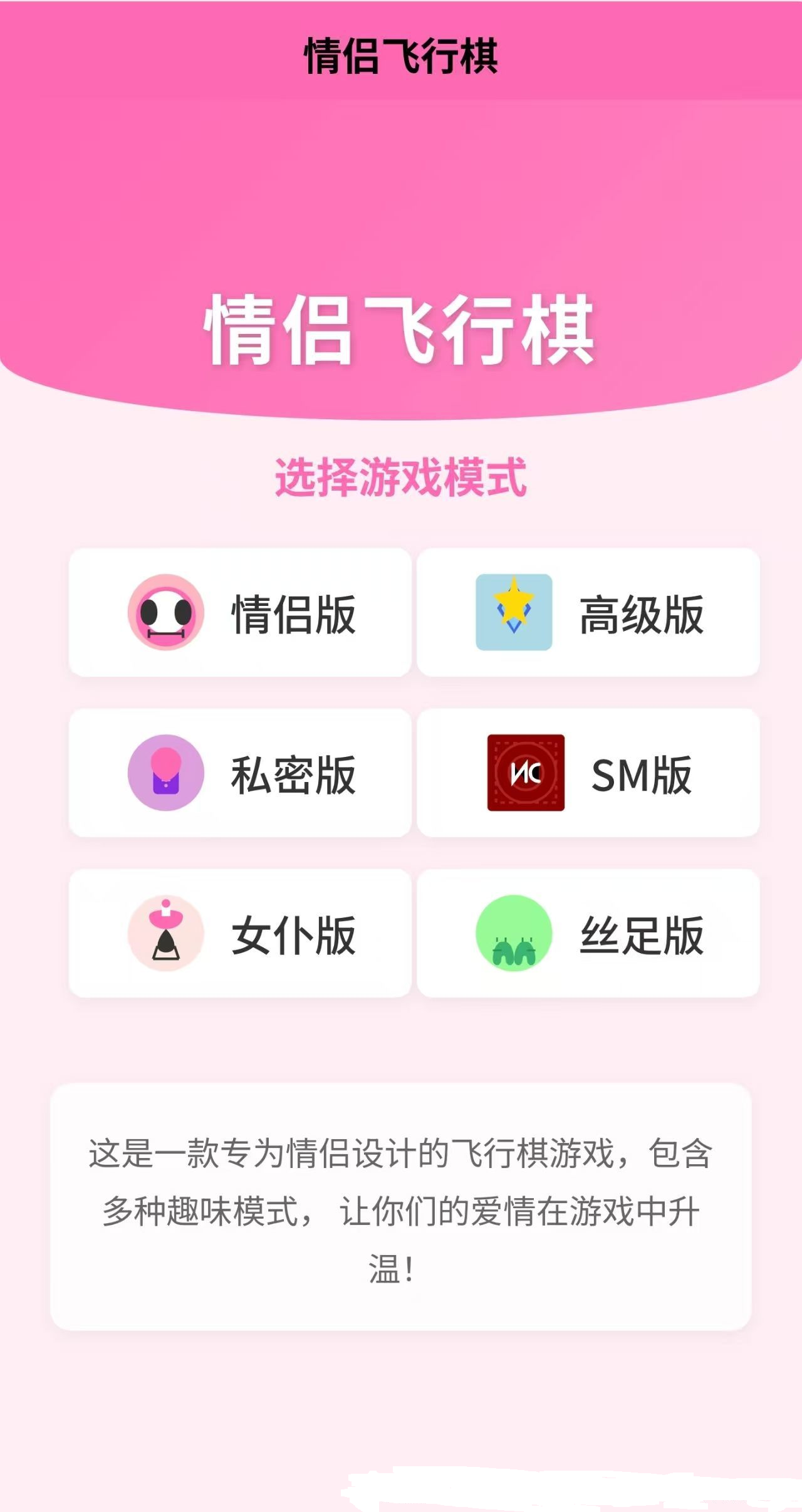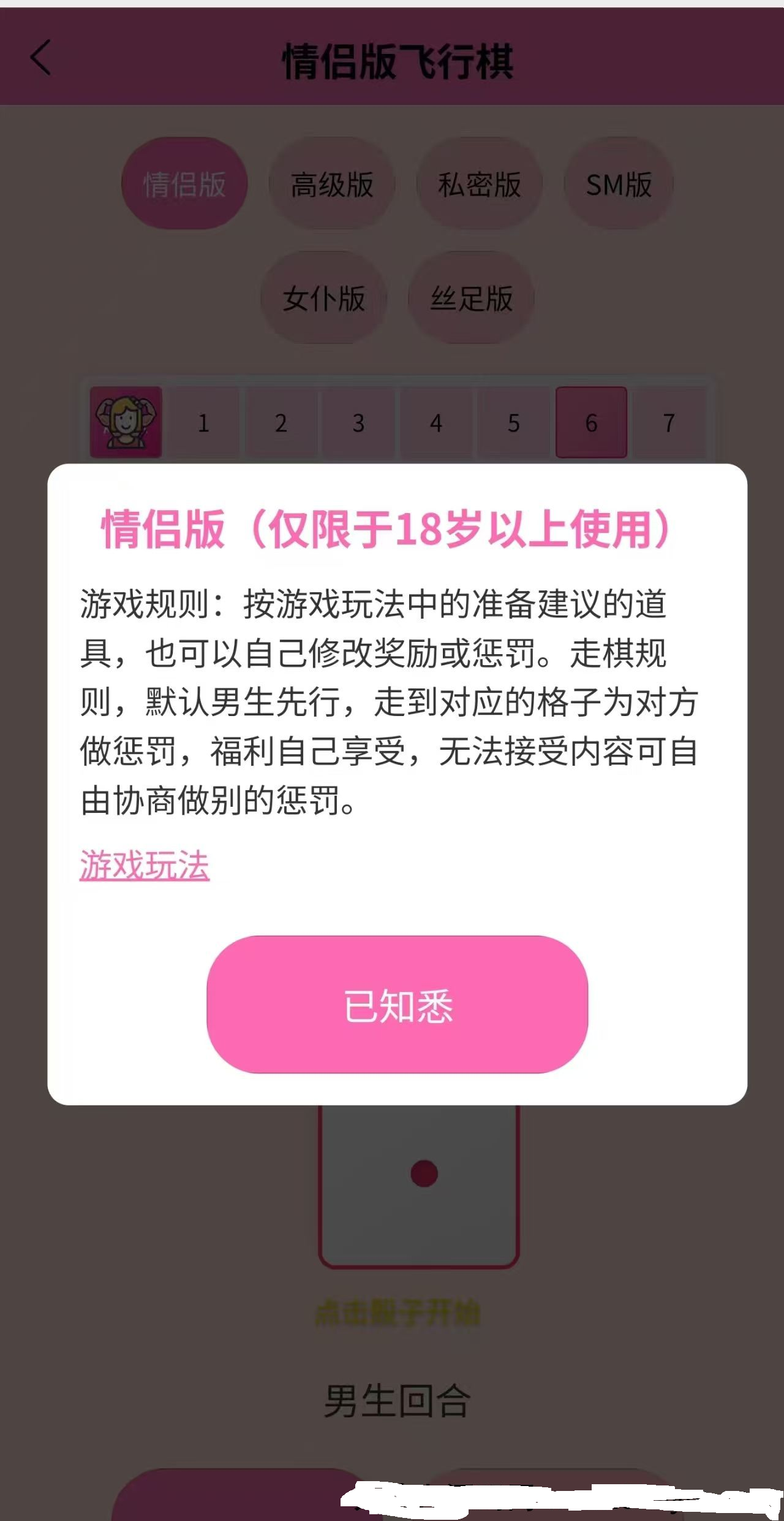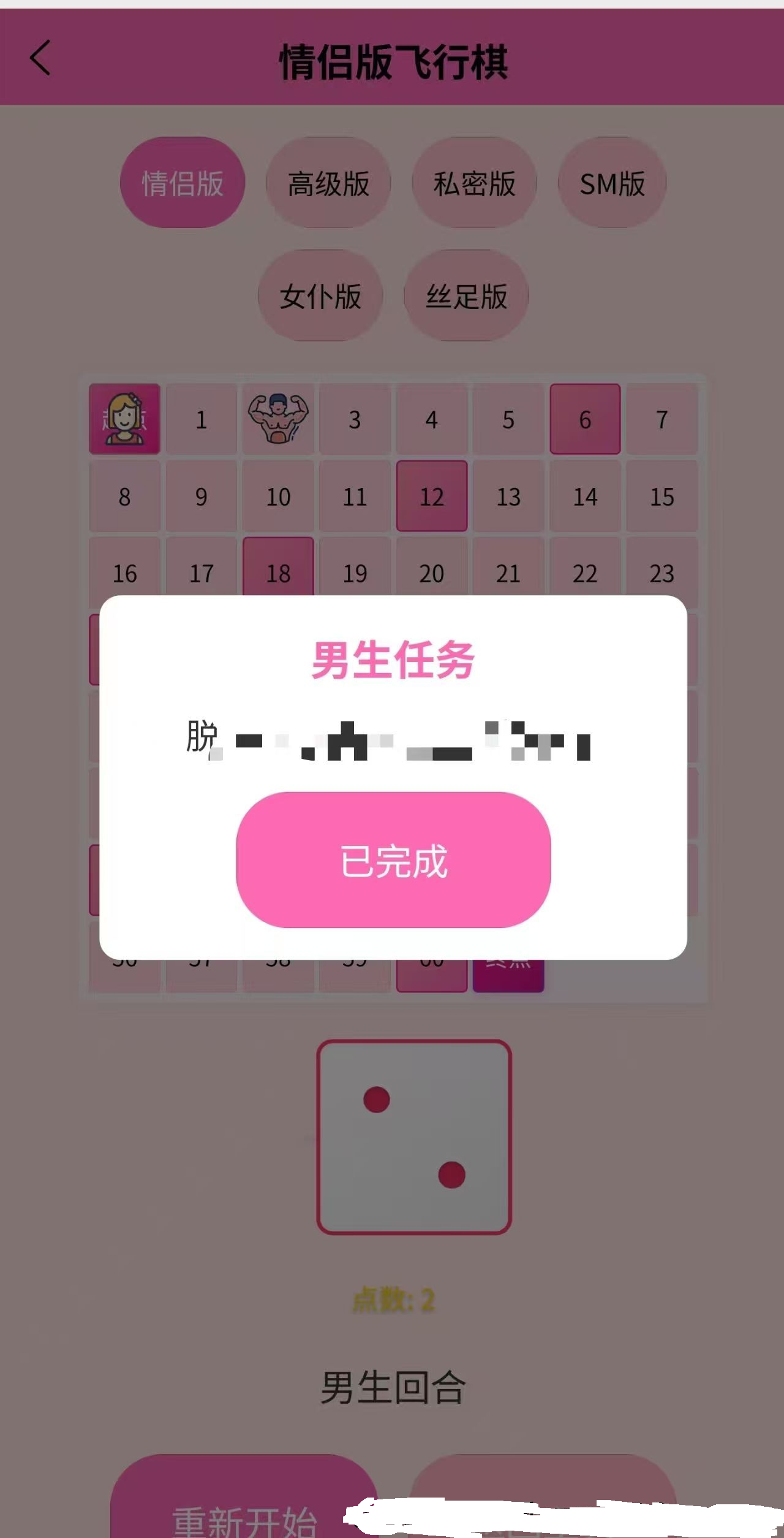 情侣飞行棋游戏 上传即可使用,自适应电脑端,手机端 专为情侣设计的飞行棋游戏,多种趣味模式可选,情侣版、高级版、私密版、SM版、女仆版、丝足版都有。男生先行,走到对应格子为对方做惩罚,福利自己享受。仅限18 ...